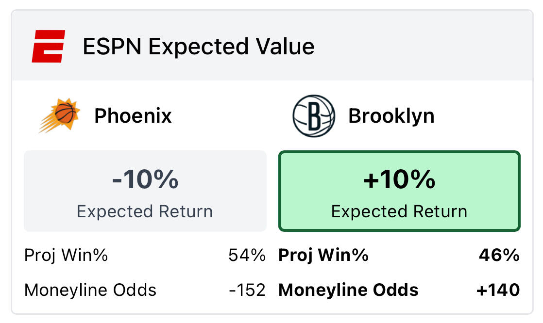 Based on a team's projected win percentage and moneyline odds, an expected return is calculated for betting on that team to win.